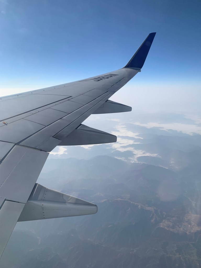 お姉様達と待ち合わせ場所まで飛行機でひとっ飛び。よく旅のYouTubeでみなさんが撮ってる飛行機の翼あたりから写してるあれ、撮りたくて20列の窓側予約。今日は嬉しくても隣にとしちゃん居ないから写真を撮って見せてあげよう。