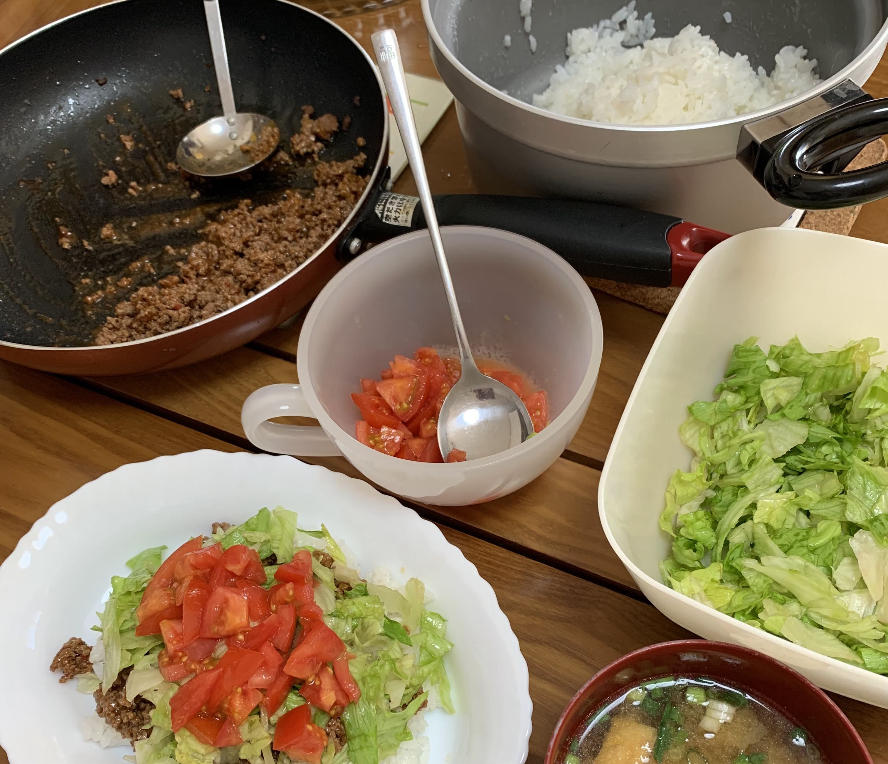 いところなんですが、タコライスに限らず、みそ汁、他のおかずもこんなスタイ