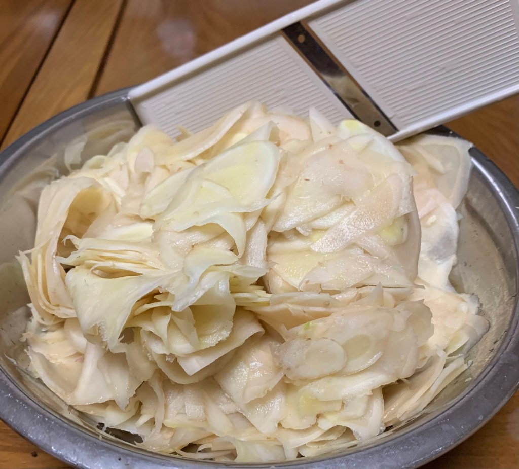 🔽注意してスライサーで切る。(調子に乗ってスイスイやるとケガします🤣)