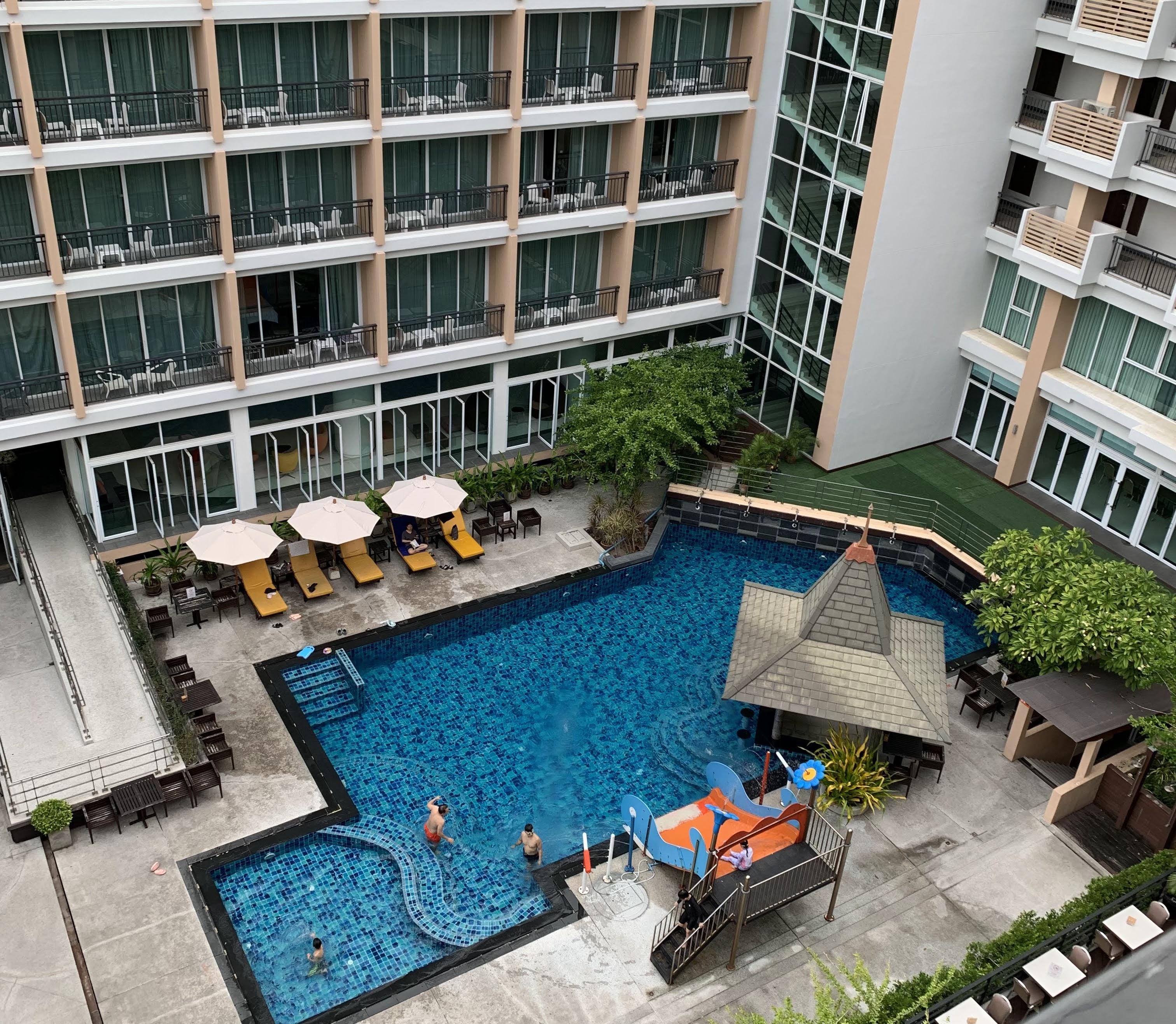 🔽部屋からの眺め このプールで2回泳いだ。気温は30℃くらい。水の温度がちょうどよく気持ちいい。まさにリゾート感🏖️雨季だけど泳げるなんて驚き。