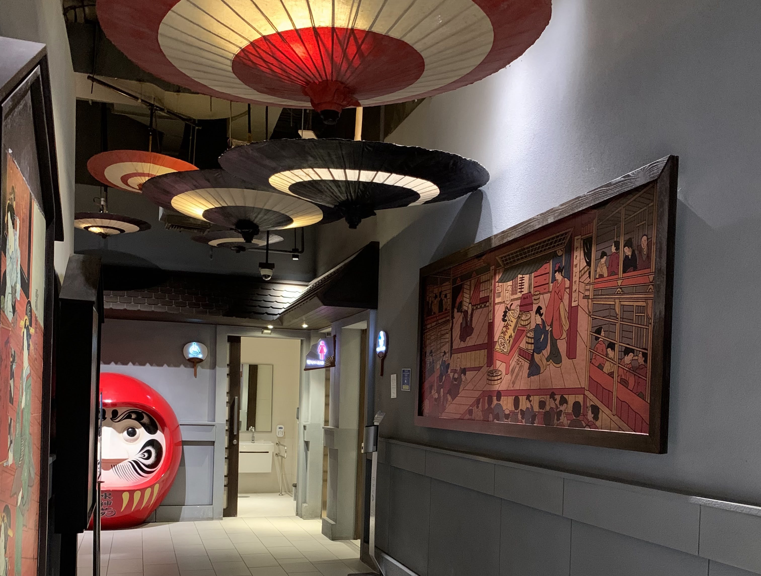 🔽東京ストリートのトイレ付近 ここまで演出されているとはステキ✨蛇の目傘、だるま、歌舞伎。雰囲気がいい!丁寧に掃除する女性に目を奪われました。