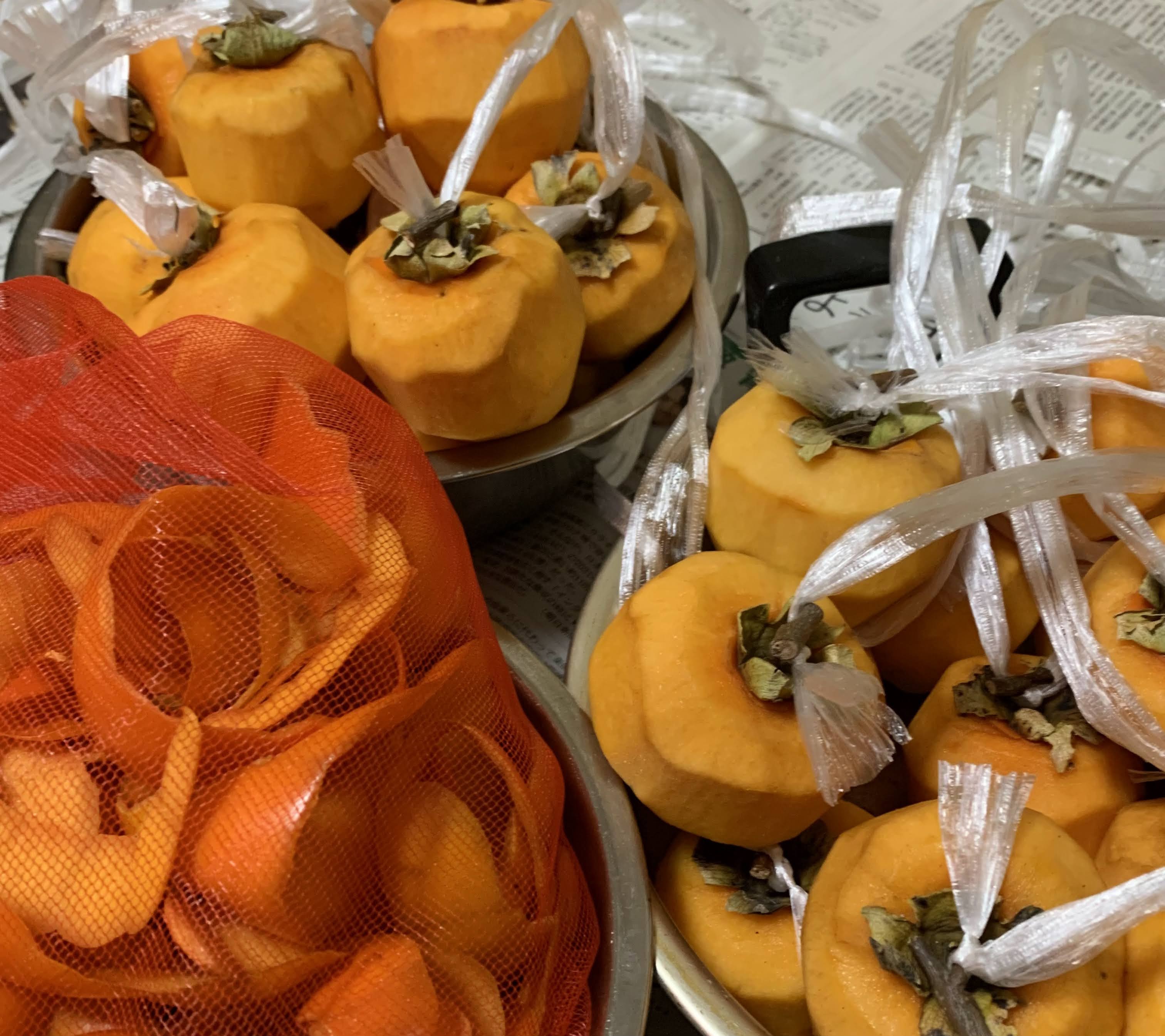 🔽皮をむいた柿を適当な長さの紐に結ぶ。(皮はネットに入れて完全に乾燥させる。後日、たくあん作りに使用)