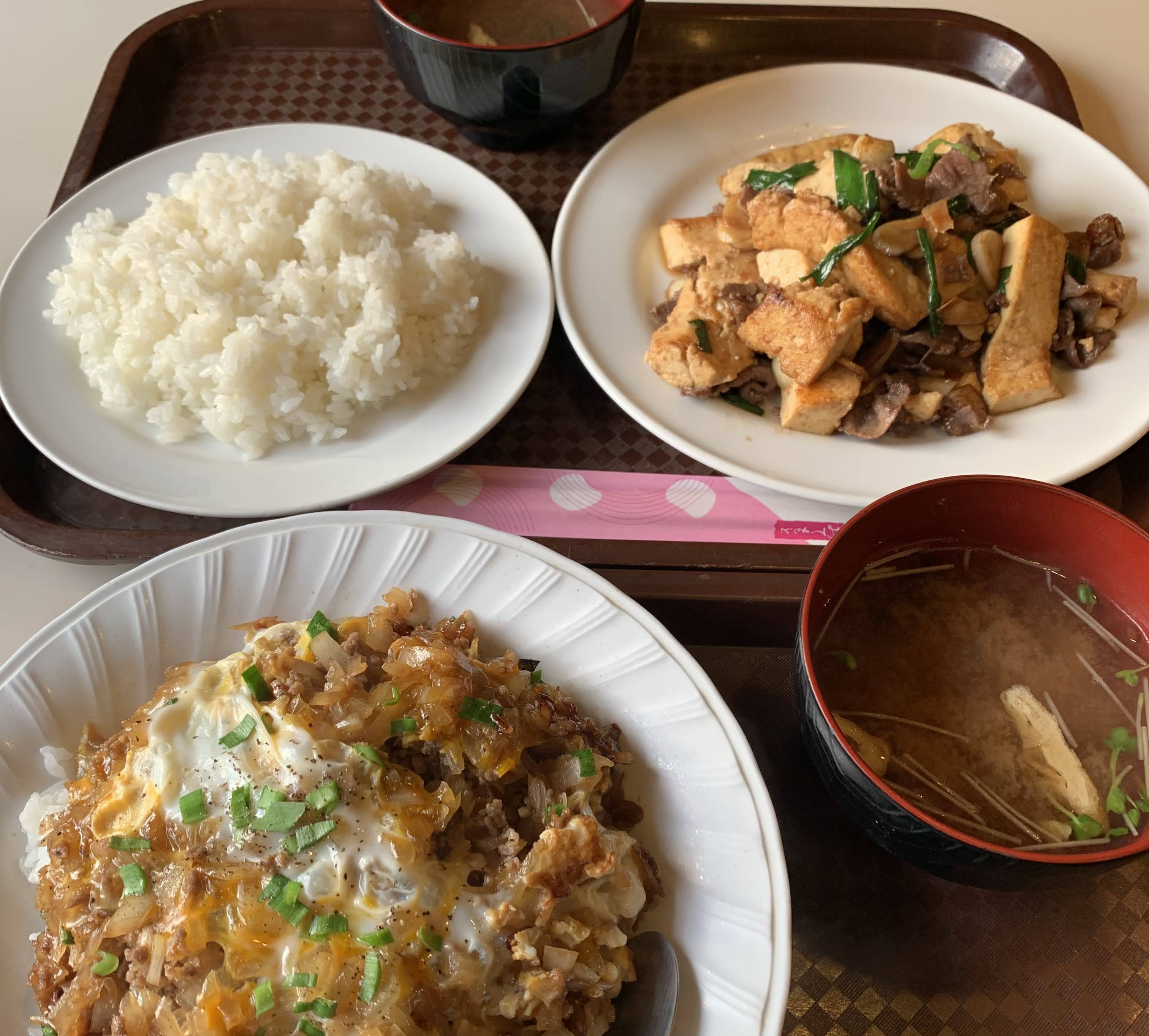上/牛肉と豆腐のニンニク炒め¥750 下/ちゃんぽん¥650(ひき肉と玉ねぎのカツどん風、味付け)