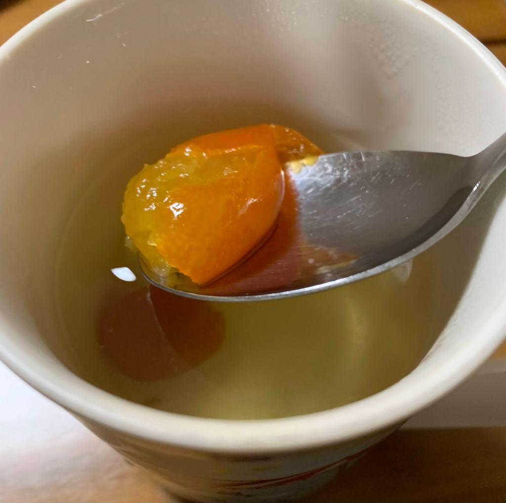 🔽マグカップに2つ金柑入れてシロップ入れて、お湯を注ぐ。