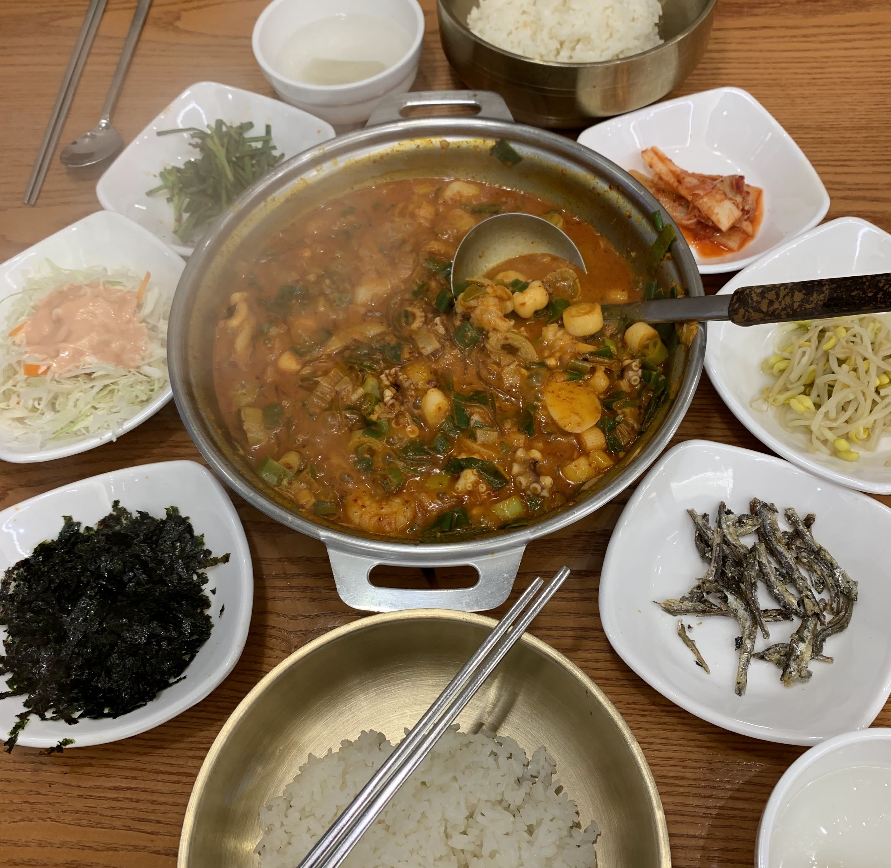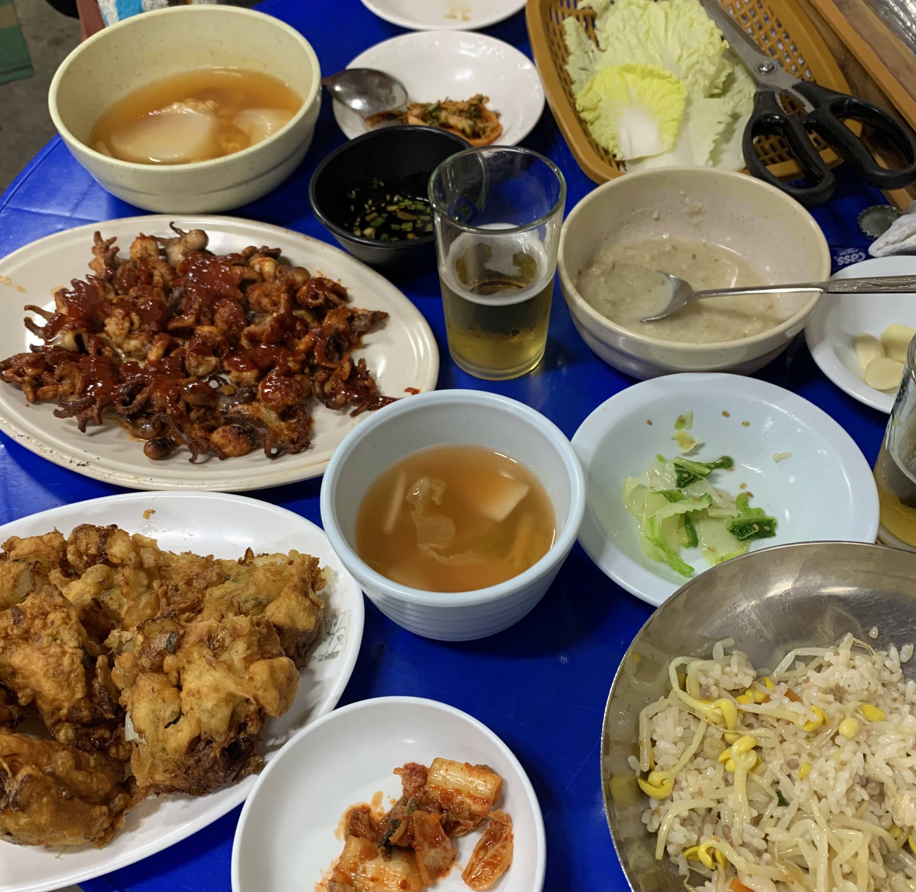 もやしご飯・チュクミ(イイダコ)・チヂミ・ビール 全¥3000くらい