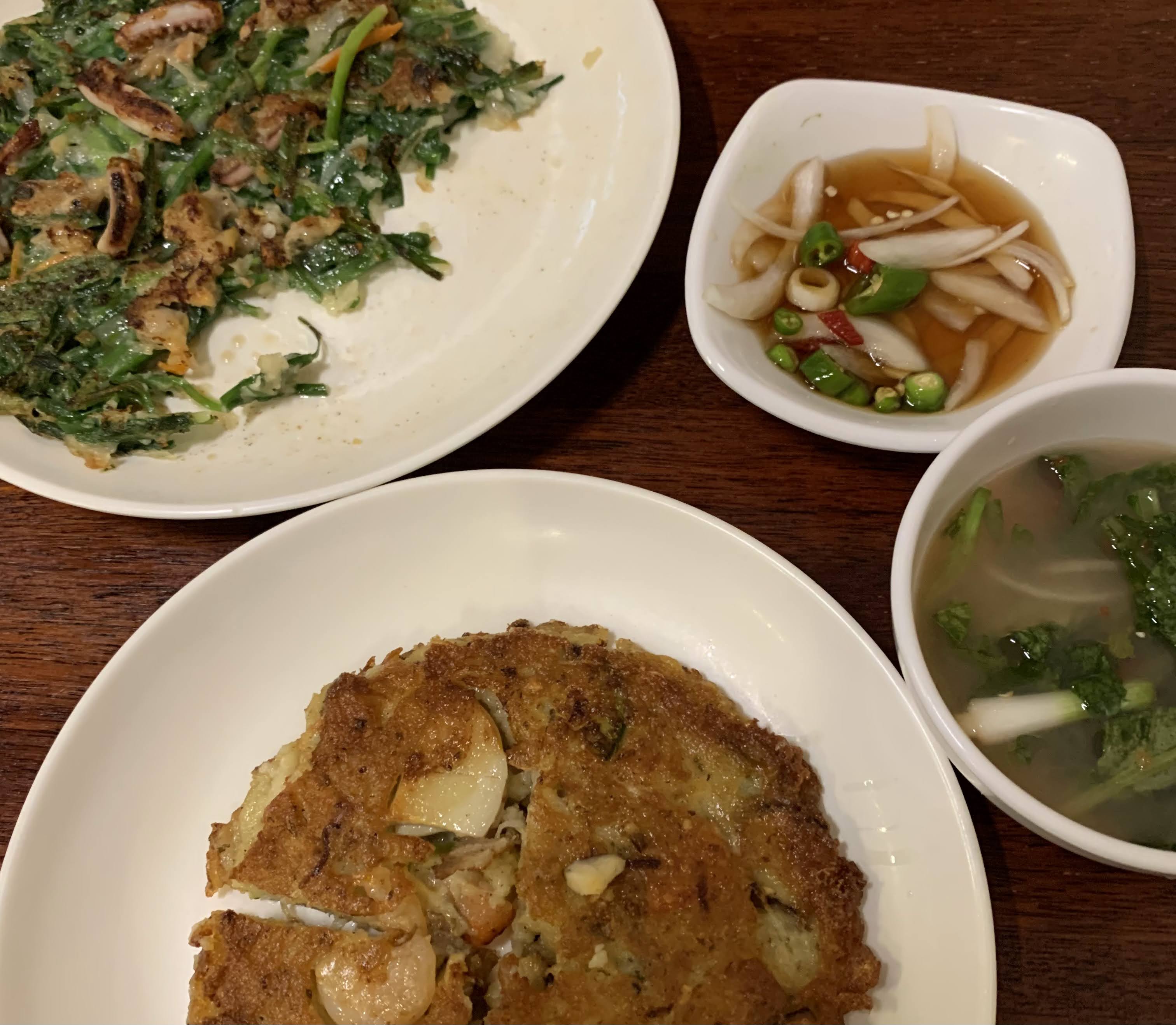 白いスープはおからのスープで優しい味。もやしご飯はシンプル具材でごま油風味。チヂミは大きく、モチっとかき揚げって感じで食べ応え満点⭕