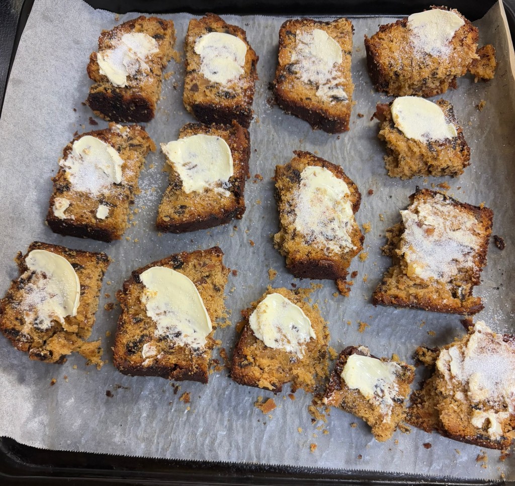 マーガリンを塗ってグラニュー糖をパラパラ、160℃で25分焼いた‼️