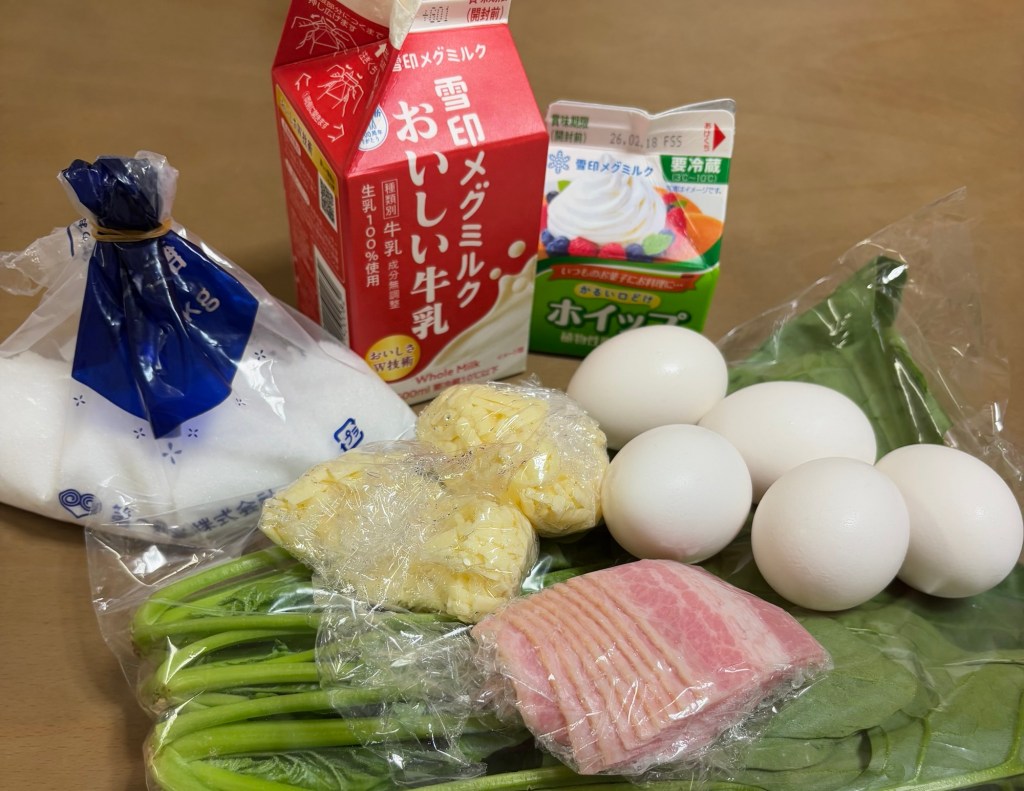 ⬇️冷凍庫にあったチーズ、ベーコンを活用し500円